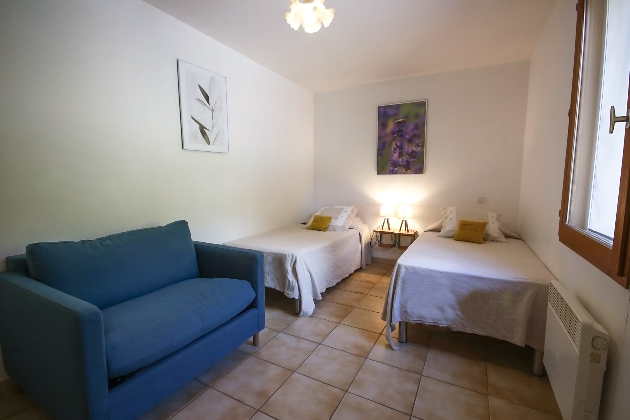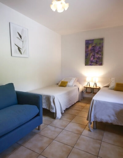 - 1 chambre avec 2 lits en 90 cm et un fauteuil convertible en 90cm