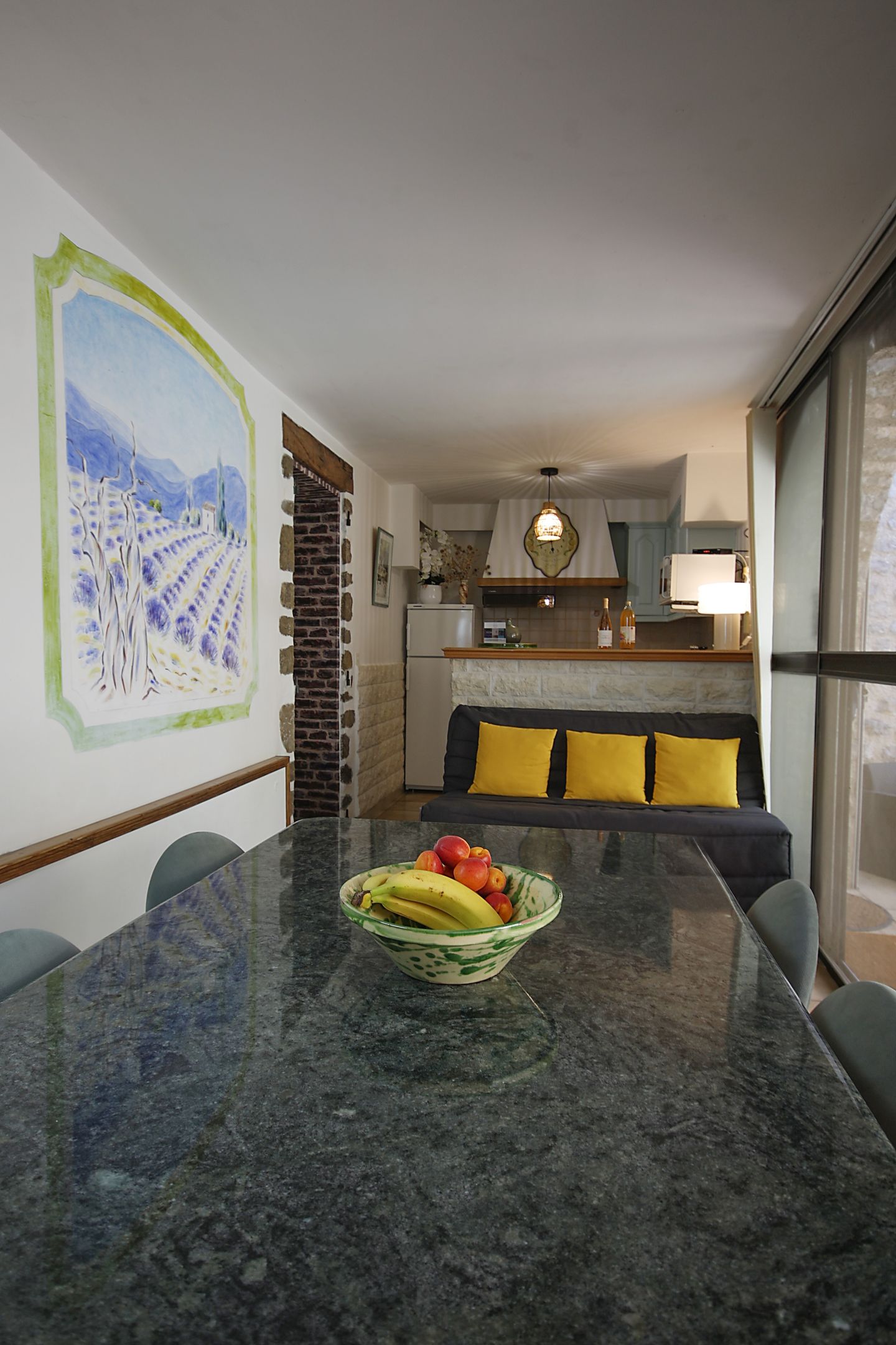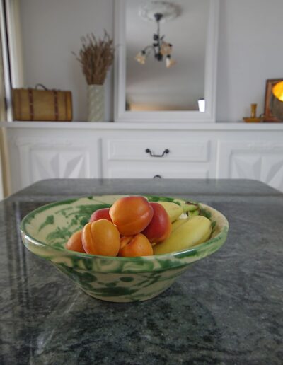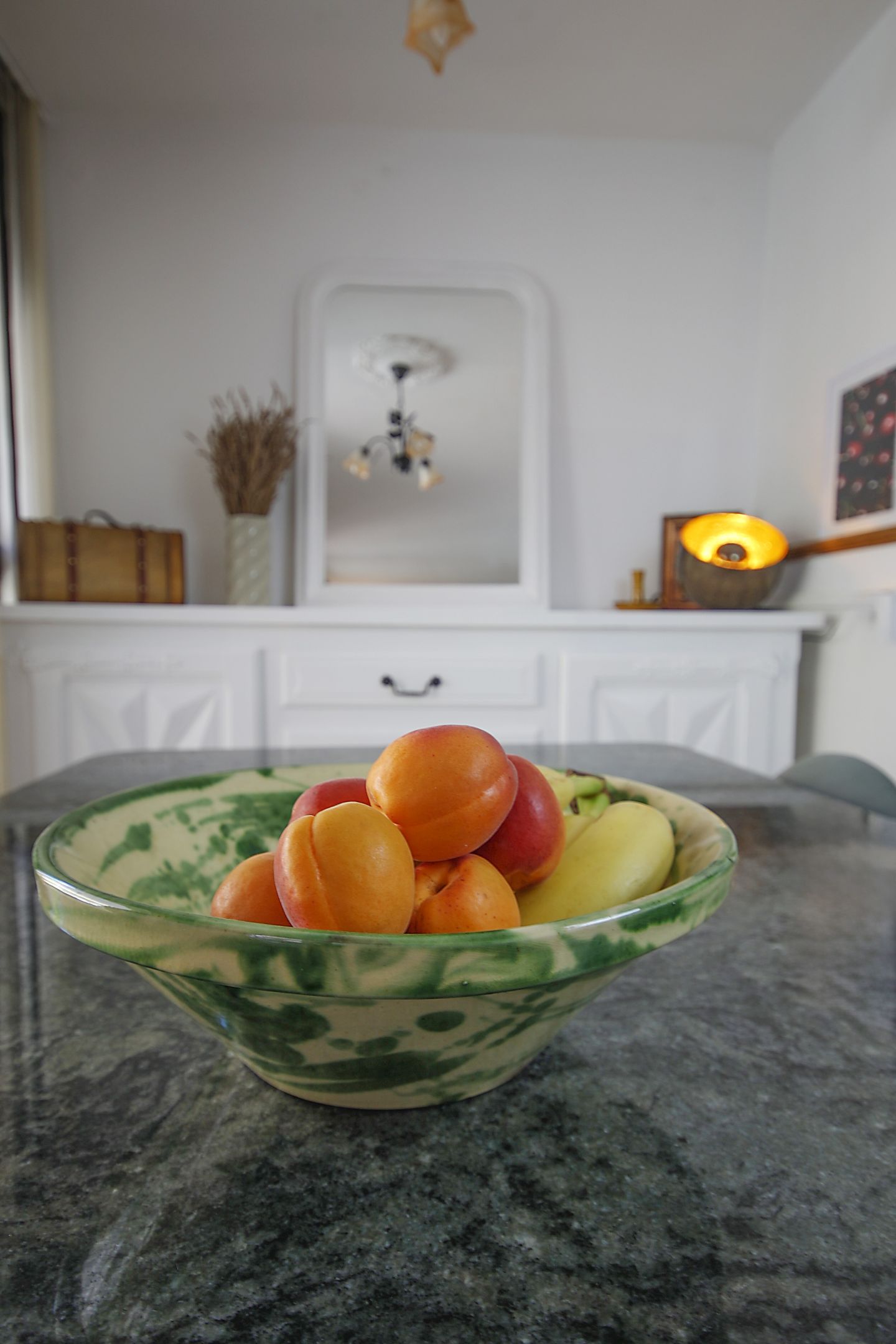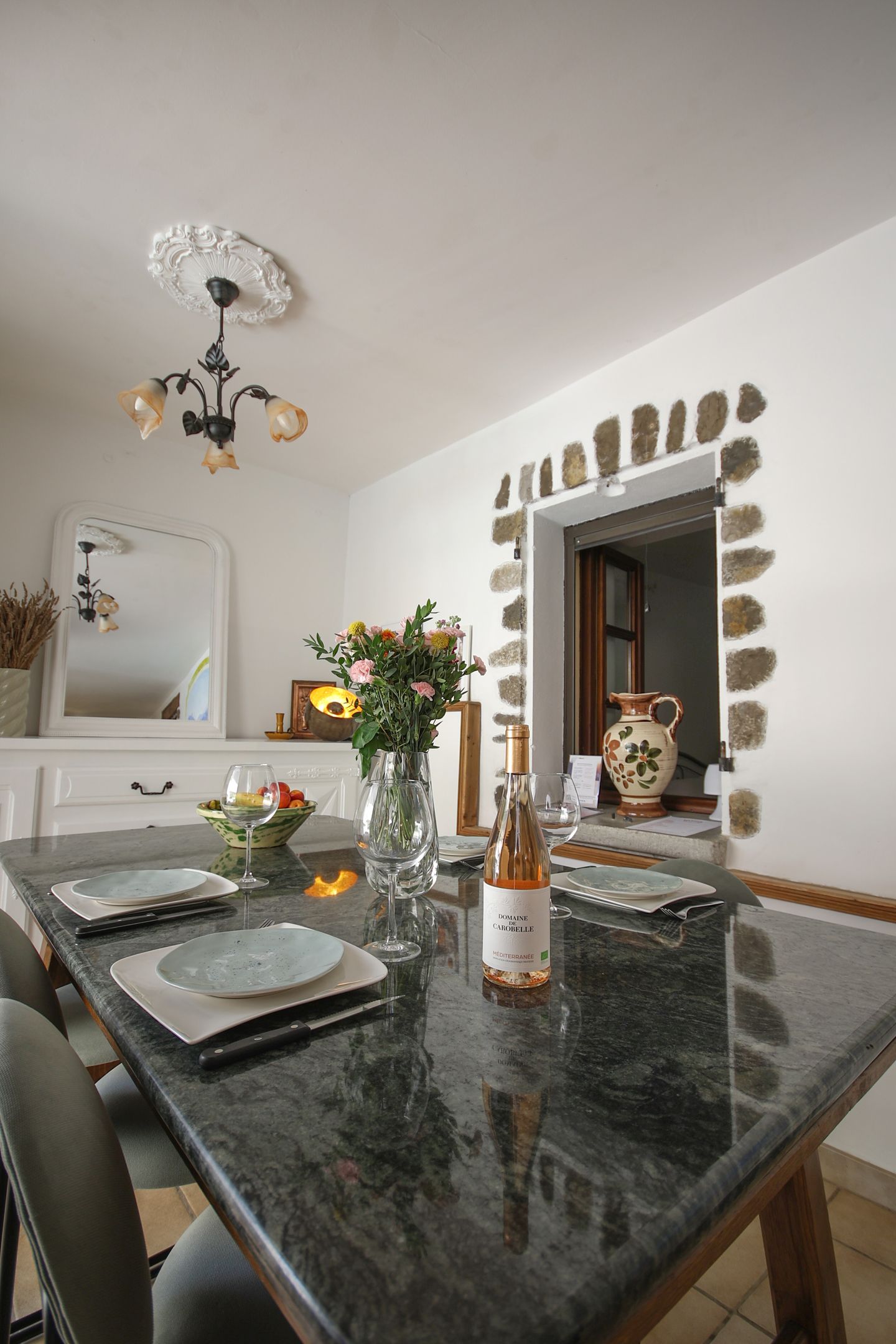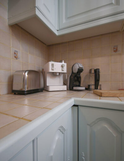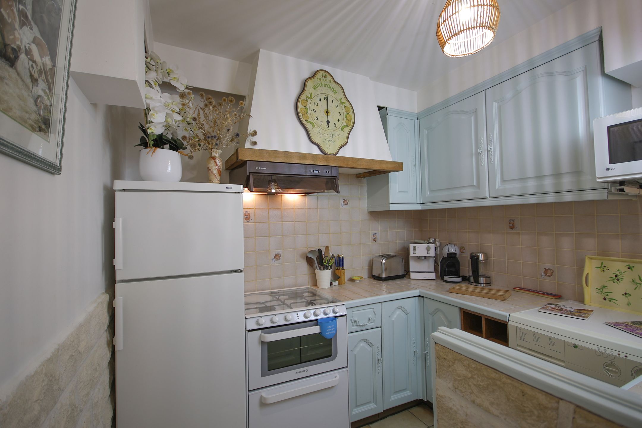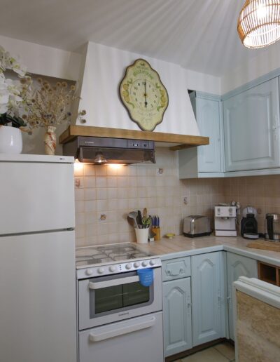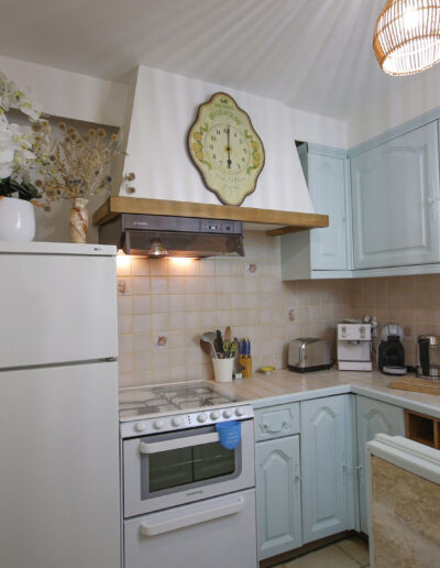 - Cuisine provençale, ouverte sur le séjour et sur-équipée : réfrigérateur, congélateur, four micro-onde, four traditionnel, plaques de cuisson électrique et à gaz, hotte aspirante, lave-vaisselle, lave-linge, cafetières (électrique, italienne, espresso et Krups), grille-pain, bouilloire électrique, blender, mixeur plongeant, appareil à raclette, ustensiles pour cuisiner et pâtisser.